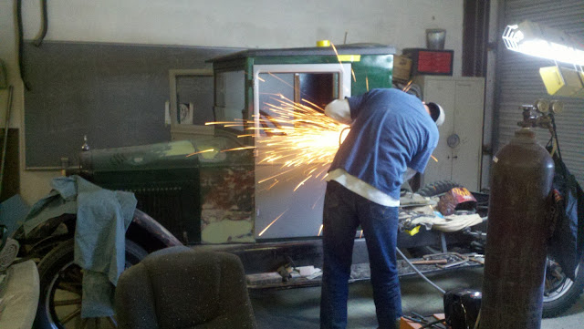 Grinding the weld where the cab was reattached, as you can see from the sparks flying. They will putty that spot, sand and smooth it and then put the back panel on. They are very close to priming the entire truck and then I can come by and sand the primer to get it as smooth as a baby's butt all around and then off to the paint shop.